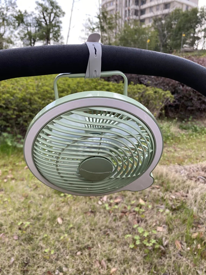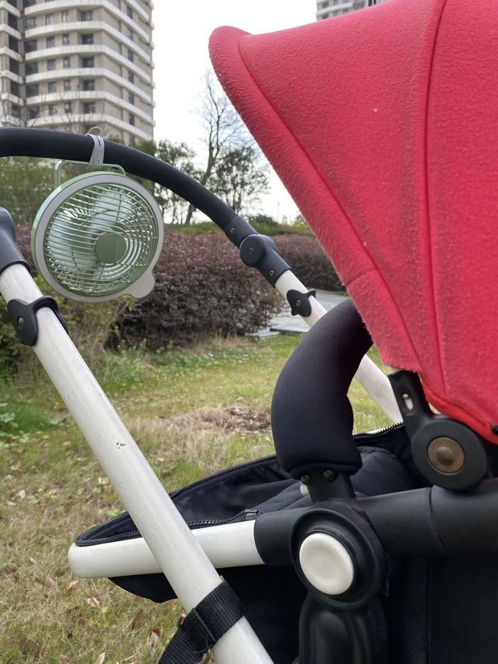 搭配赠送的硅胶绑带,可以固定在婴儿车上,外出时婴儿车上使用,宝宝夏日溜达也能享受自然柔和风了。