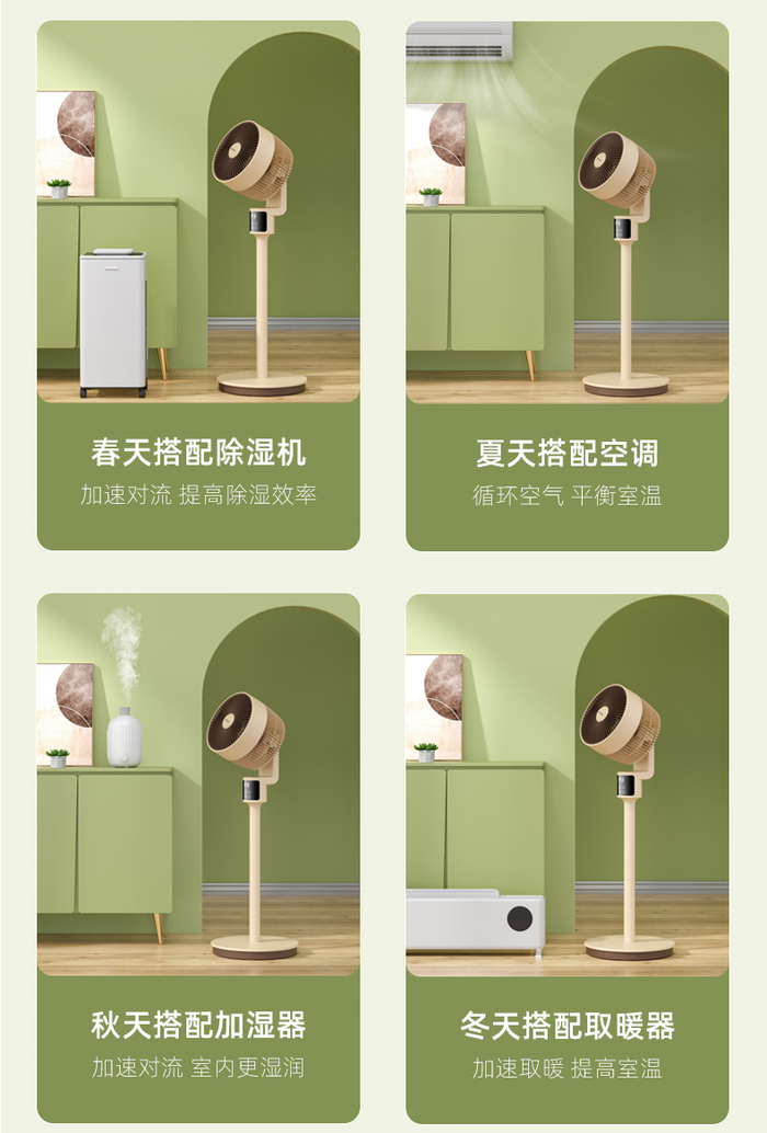 下图,根据四季不同情况,搭配其它家电使用,1+1>2,能让家电发挥更大的作用。