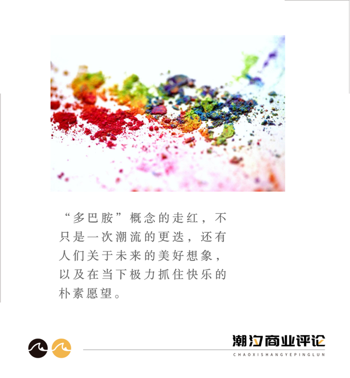 就实际的视觉体验而言,“多巴胺穿搭”一改过去流行的精致优雅和朴素低调的色彩风格,在用高饱和度的颜色吸引眼球的同时,也让人感受到活泼、欢快的情绪。因此在“多巴胺穿搭”走红网络之后,“多巴胺”一词除了特指高亮、混搭的配色风格外,也具有了“快乐因子”的引申含义。