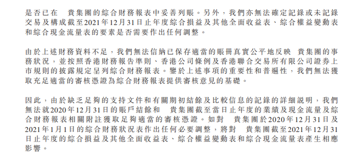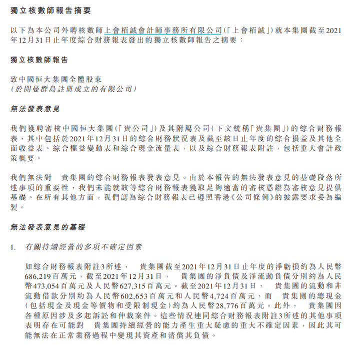 香港上会柏诚会计所出具的中国恒大(3333.HK)2021年报审计报告,无法表示意见。