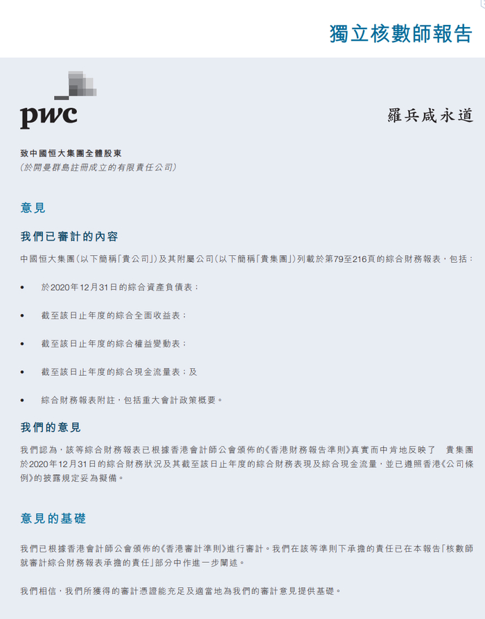 香港罗兵咸永道会计所出具的中国恒大(3333.HK)2020年报审计报告,无保留意见。