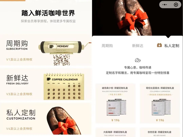 咖啡豆私人定制:V4~V6会员享受咖啡私人定制服务,定制标签与专属礼盒包装等等。
