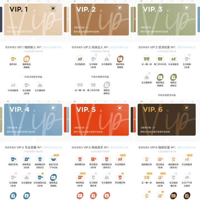 于是,皮爷咖啡重塑会员体系,在保留月度/年度优惠券、生日专享等常规会员权益的基础上,加密了等级密度,将会员划分为6个等级。