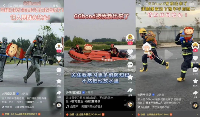 在快手输入“GGBond被我抓走了”,可以看到各路政务官方号“绑架”猪猪侠的视频,猪猪侠被绑在各种危险的地方,62米举高喷射的消防车上、飞往太空的火箭上、深水里、城楼上……绑架者们的诉求是“来跟我学救援技术、反诈知识、消防知识、防溺水知识……我就放了他。“