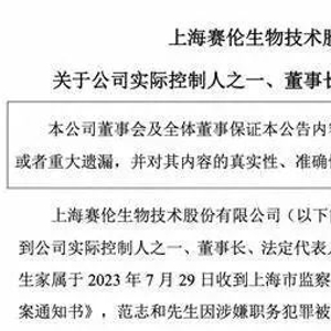 日前,赛伦生物发布公告称,公司实际控制人之一、董事长、法定代表人范志和因涉嫌职务犯罪被实施留置并立案调查。