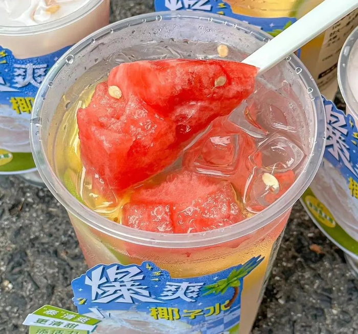 热门单品椰子制作中,椰子水的使用占比更高,出品搭配茶底、绿豆、柠檬、西瓜等元素,做极致清爽。
