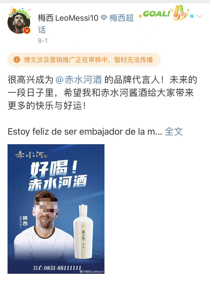 “很高兴成为@赤水河酒 的品牌代言人!未来的一段日子里,希望我和赤水河酱酒给大家带来更多的快乐与好运!”这是国际知名球星梅西为赤水河酒打的最新广告。