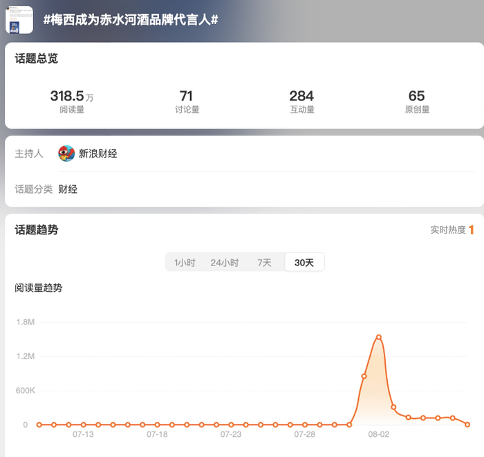 从微博话题的热度来看,#梅西成为赤水河酒品牌代言人#的话题并未激起多大的水花,讨论量与互动量可以说少得可怜,而阅读量趋势也仅维持了三天便无人问津。很显然,在后续没有衔接的情况下,梅西的热度已经褪去。