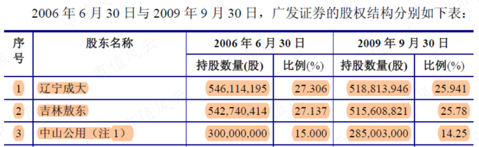 在广发证券借壳之前,吉林敖东、辽宁成大、中山公用就已是其前三大股东,其中吉林敖东还是发起人之一。后来2004年前后,吉林敖东、辽宁成大又接盘了一部分股东的股权。