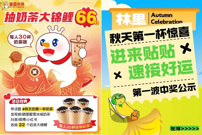 蜜雪冰城的“秋一杯”很让人动心:活动期间,用户在抖音、微博、小红书,带话题“秋天的第一杯奶茶”,发视频/晒图蜜雪冰城奶茶,抽66个奶茶锦鲤,雪王承包1个月的奶茶。