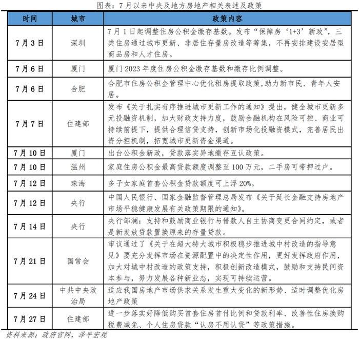 近期政策积极信号频出,黎明就在前方,优质民营房企不要倒在黎明前。7月24日国家提出“适应我国房地产市场供求关系发生重大变化的新形势,适时调整优化房地产政策”。7月27日,住建部表示,进一步落实好降低购买首套住房首付比例和贷款利率、改善性住房换购税费减免、个人住房贷款“认房不用认贷”等政策措施。