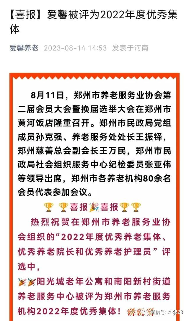 值得一提的是,就在前几天,郑州市养老服务业协会第二届会员大会召开,本案所发生的爱馨阳光城老年公寓,被评为“郑州市养老服务机构2022年度优秀集体”。