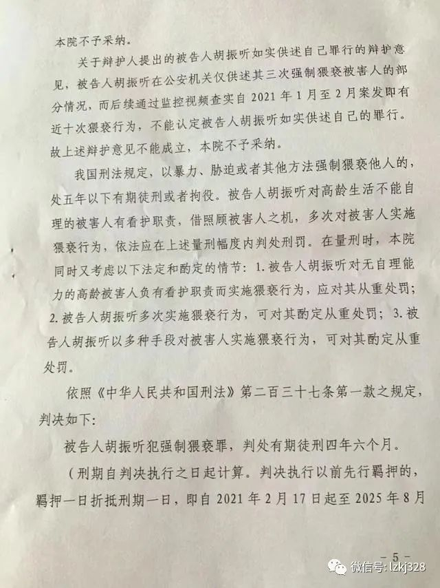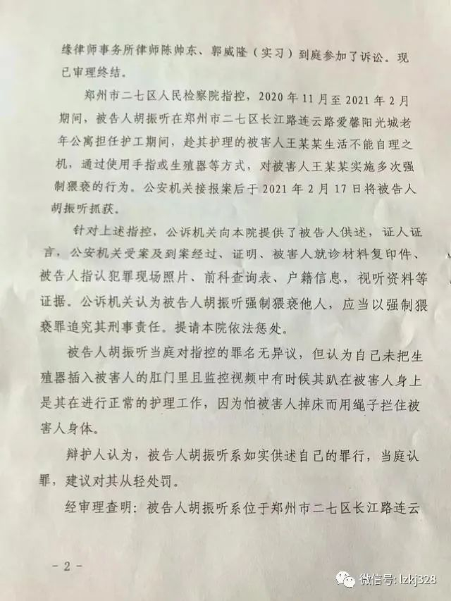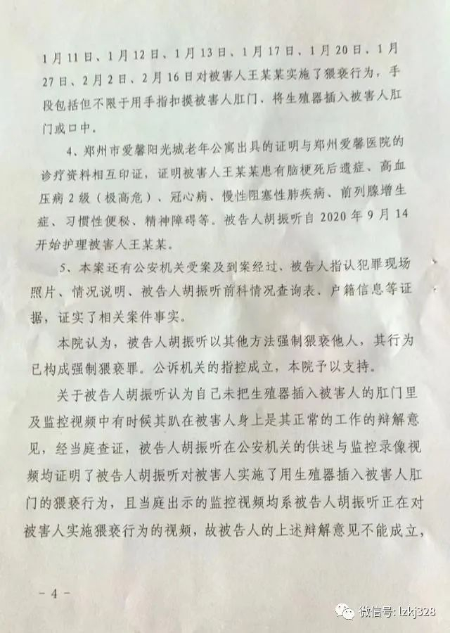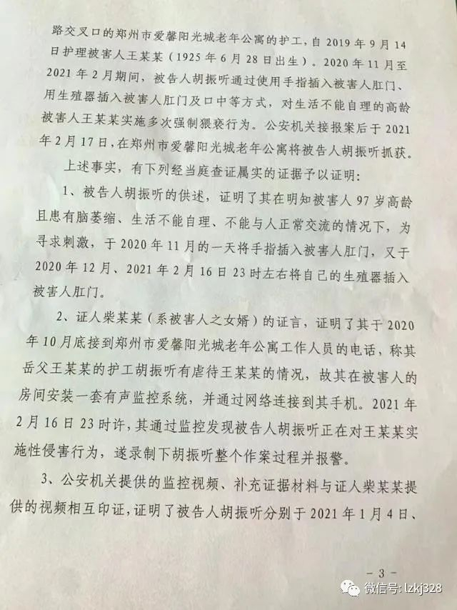 案件资料显示,郑州市二七区人民检察院指控,2020年11月至2021年2月期间,老年公寓的护工胡振听,趁老人生活不能自理之机,通过使用手指或生殖器等方式,对老人多次实施强制猥亵。