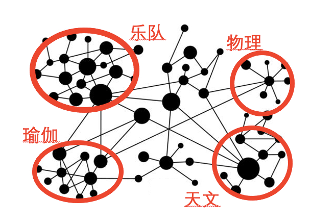 通常我们认为,一个互联网产品用户越多,价值就越大,但真实世界存在的网络并不是一个规则的结构,而是像下图一样规模不一,呈群落状的结构,比如家庭、学校、共同兴趣的圈子是相对紧密的结构,而不同喜好、背景并且缺乏已有关系链的用户很难短时间建立起来关系,没有关系也就没办法触发网络效应,因此,即使如Meta、字节等流量运营专家,此前选择简单粗暴流量导入的方式扶持新产品,也很难成功。