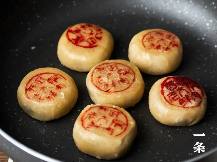 开小火,不用刷油,直接放入鲜肉酥饼,同样把有字的那面朝上。