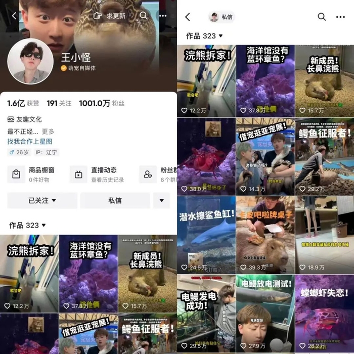 例如B站up主@天青色等_烟雨是一位专注于异宠的创作者,一只自己饲养的宠物鳄鱼甚至可以穿上女仆装发出呆萌的叫声,单个视频的最高播放量已经突破600万;@王小怪 是一位专注于饲养海洋生物的创作者,慢慢地也衍生出了蜥蜴、豚鼠等小众动物,凭借幽默的配音与新奇的物种积累了1000万的粉丝。