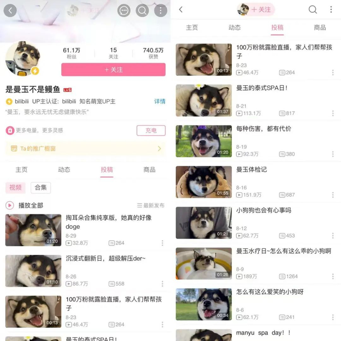 @是曼玉不是鳗鱼 是B站新涌现的一位萌宠UP主,他的视频中,一只黑色柴犬就像“人”一样与创作者进行互动。在接受按摩时,它会露出享受的表情,穿上好看的裙子,也会对着镜头露出微笑……从4月至今,@是曼玉不是鱼 收获了60多万粉丝的喜爱,成为了B站萌宠赛道的“黑马”。