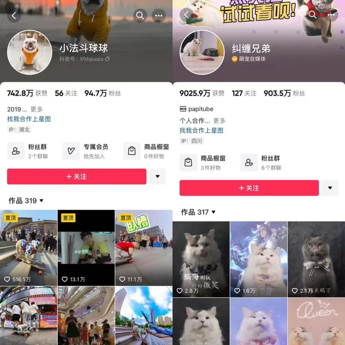 例如“小法斗球球”,视频中那只会滑滑板的斗牛犬自带可爱又搞笑的属性,毕竟谁也想不到一只斗牛犬能够轻松驾驭滑板。再比如拥有近900 万粉丝的抖音账号“纠缠兄弟”,凭借幽默搞笑的剧情和巧妙的运镜方式,用会唱魔性rap的两只猫咪获得了大批粉丝的喜爱。