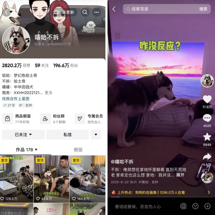 @嘻哈不拆 是抖音记录萌宠日常生活的创作者,三只不同品种、不同性格的狗狗各具特色,吸引了196万粉丝的关注。尤其是一只名叫“不拆”的哈士奇,视频中它几乎只黏着自己的“爸爸”,对“妈妈”的关怀爱搭不理,被粉丝戏称为“爹宝狗”。