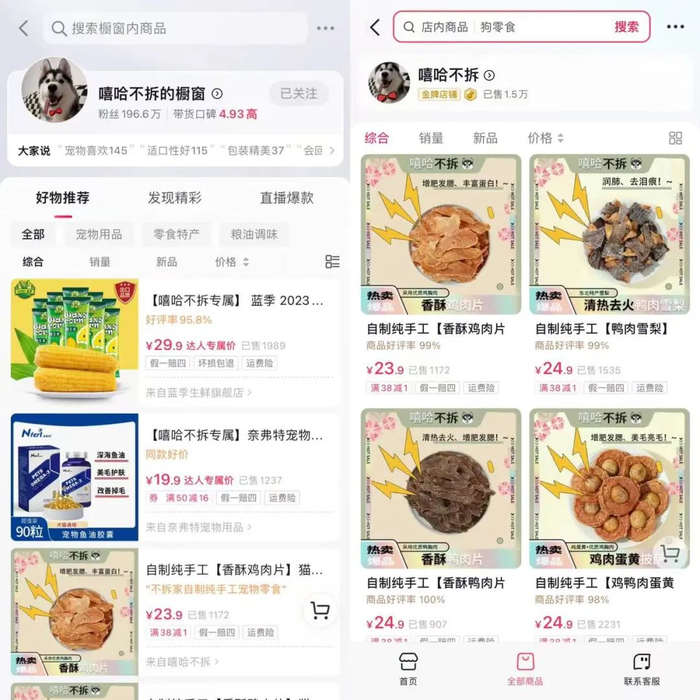 在广告收入并不理想的情况下,许多宠物博主开始开通店铺售卖宠物食品、用品、玩具等商品,通过电商的方式解决广告植入变现不稳定的难题,甚至开通了自己的直播带货。
