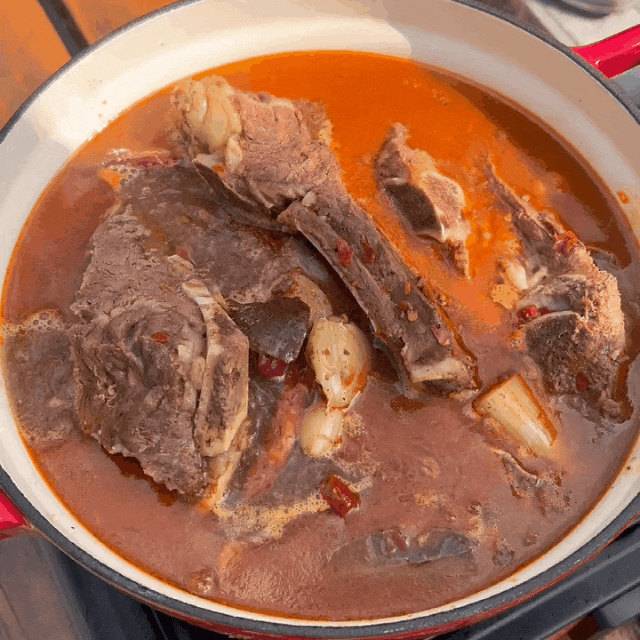 3.倒一些酒,再倒入热开水,水没过牛肋排,中小火炖煮1.5-2小时,筷子能轻松插进肉里就差不多了,最后收汁!开动!