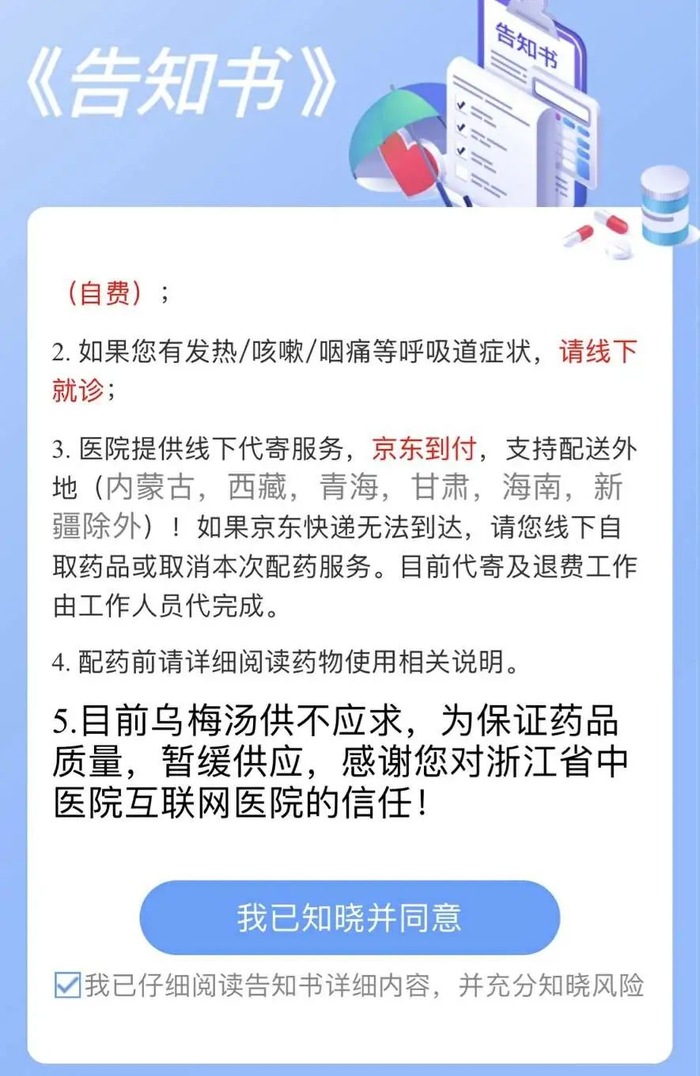 抢购、代购,还差一个黄牛就完整了。如今点开浙江省中医院的支付宝界面第一个跳出来的是《告知书》,特大字号地宣布:乌梅汤供不应求。不仅如此,减脂饮也没光了,还直接把支付宝的便捷购药功能关闭了。