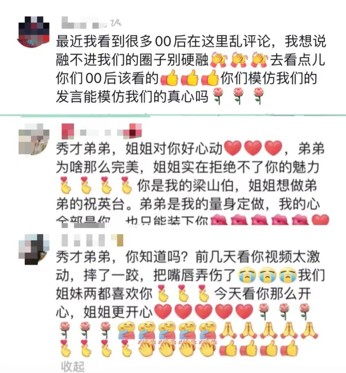 顶级颜值的男明星们一不小心都会被年轻人嫌弃油腻(比如杨洋),更不要说秀才这种一举一动都透着油的。而这样的人设,却成为了妈妈辈们的梦中情人,让平时严肃的长辈们在网上说着肉麻的情话,着实新奇。于是评论区、弹幕区成为了很多年轻人们调侃的天地。