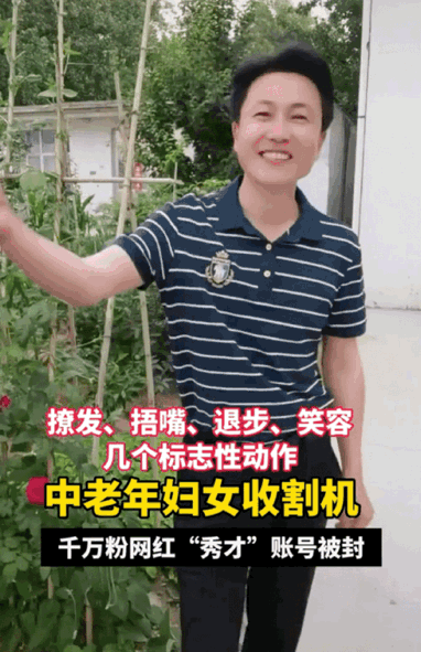 最后,形象。秀才的长相在普通中年人里是算是端正帅气的,再通过符合中老年人审美的Polo衫穿搭以及标志性动作——一捂二舔三撩发,阿姨直接被拿下。是的,在年轻人眼里油腻的形象,在中老年人眼里可能是儒雅、阳光,符合她们对于温情、关怀的渴望。