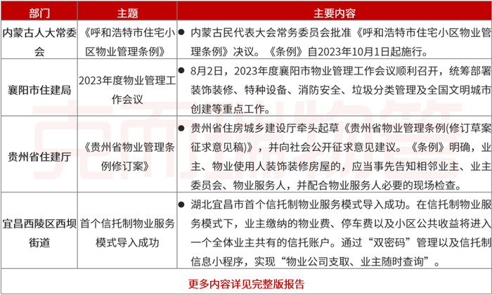 内蒙古人民代表大会常务委员会批准《呼和浩特市住宅小区物业管理条例》、贵州省住房城乡建设厅《贵州省物业管理条例(修订草案征求意见稿)》、河南省人大常委会审议《洛阳市住宅物业管理条例》等。