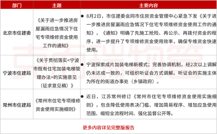 北京市印发《关于进一步推进房屋漏雨应急情况下住宅专项维修资金使用工作的通知》、常州修订《常州市住宅专项维修资金使用实施细则》。