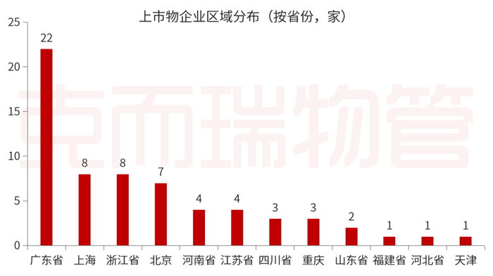 截至目前,64家上市物企分布在全国12个省、直辖市,共计17个城市。其中,广东省仍是上市物企最多的省份,有22家上市物企,占上市企业总数的34.3%。北上广深四个一线城市上市物企共有34家,占比超五成(53.1%)。其中,深圳为上市物企数量最多的城市,达10家,占比15.6%;广州市、上海市和北京市则分别有9家、8家和7家,占比分别为14.1%、12.5%和10.9%。