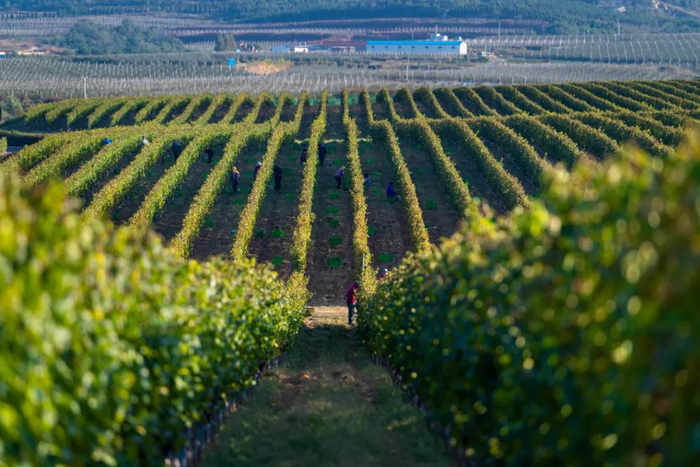 |长城葡萄酒蓬莱产区龙脊园内的采收场景