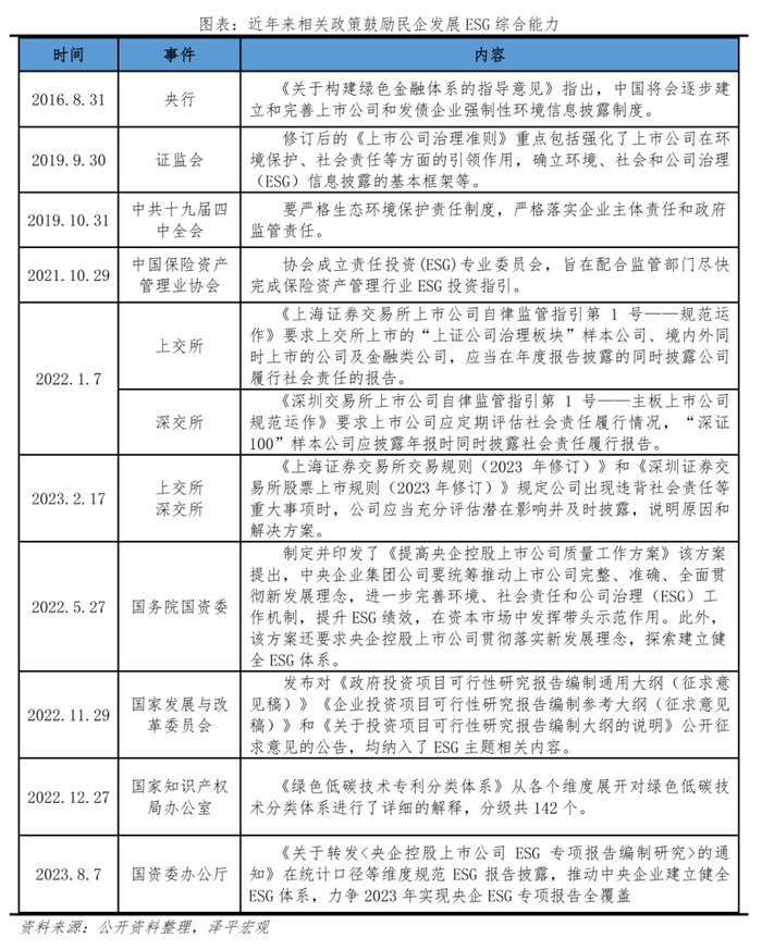 ESG政策逐步完善,从点到面推动ESG体系规范发展。中国ESG监管政策自2012年银监会发布《绿色信贷指引》开始,逐步从方向性、战略性指导的体系构建式政策转变为框架与细节并进的政策体系。近年来大小政策结合,各部门和社会组织协调配合加速推动民营经济上下游ESG理念的贯通。但与国外先进的ESG体系相比,我国ESG建设程度仍然明显滞后。未来ESG将是国内外经济发展的大势所趋,我国对ESG体系建设和监管的重视程度将进一步提高。