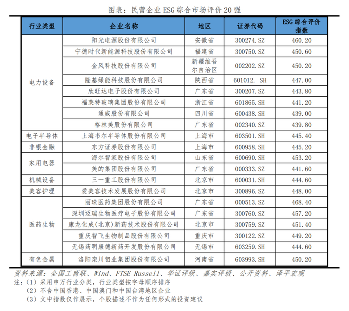 从行业看,电力设备和医药生物行业的企业占比过半。民企ESG综合评价排名前20强中,新能源产业链企业在环境维度的贡献拉高了电力设备行业的占比,家用电器、非银金融、机械设备、美容护理和有色金属在内的传统行业和以电子半导体为代表的新兴行业皆有代表性企业。