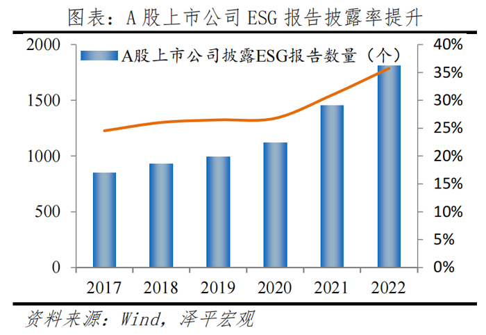 ESG是通过环境(Environment)、社会(Social)、治理(Governance),三个维度考察企业中长期发展潜力。2017-2022年,A股上市公司披露ESG报告的数量从851家增至1812家,披露率从24.55%快速增至35.76%,其中金融和公用事业行业披露率位居前列。