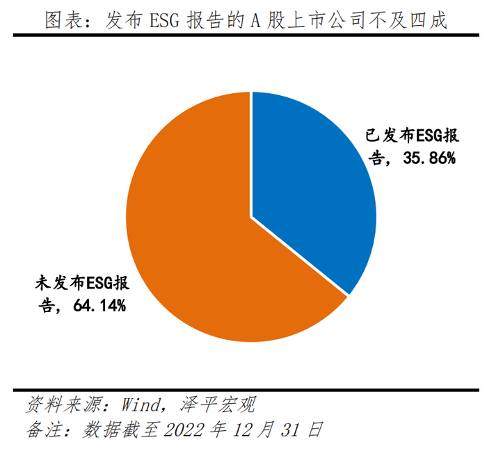 对ESG重视不足,信息披露不够全面。目前国内的ESG投资刚刚兴起,不少企业对ESG还未有准确的认知或重视不足。截至2022年底,A股上市公司的ESG报告披露率仅有35.76%,中小企业对ESG的信息披露和透明度有限。由于缺乏自上而下统一的ESG信息披露要求与标准,企业ESG披露信息不够详尽或良莠不齐,从ESG的宣传研究到现实实践依旧存在差距。