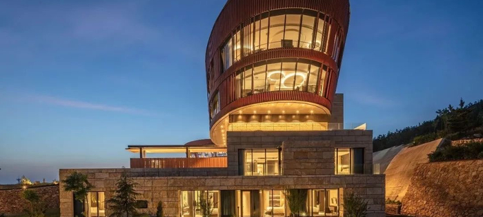 据说,有一头醉酒的金牛偷跑到蓬莱仙境,就再也不舍离去,“逃牛岭”一名由此得来。传说很美,现实里的逃牛岭酒庄也是别具一格。酒庄的主体建筑犹如两个巨型醒酒器,像一对豪气冲天的牛角耸立在丘山之间。