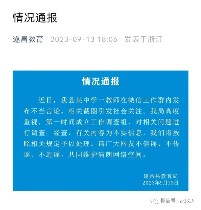 9月13日晚上,遂昌县教育局发布《情况通报》: