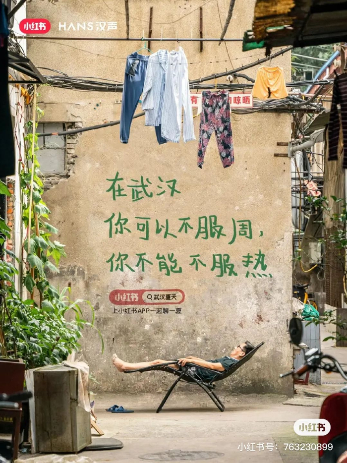 小红书今年就曾联合机构针对武汉夏天做了一系列营销,其中的重要一环是发布了 12 组海报,写着“去泳池那叫下饺子,去江里那才叫游泳”、“在武汉,你可以不服周,你不能不服热”等。