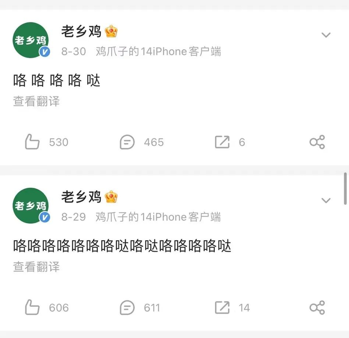 老乡鸡在社交媒体上一直很活跃,其微博小编放飞自我,每天沉迷于“咯咯哒”和摸鱼,与网友打成一片,是很多传统品牌学习如何更具网感的对象,但官方账号终究代表着企业,放飞还需注意尺度,尤其是自嘲可以大胆,但当玩梗牵涉他人时,更需谨慎。