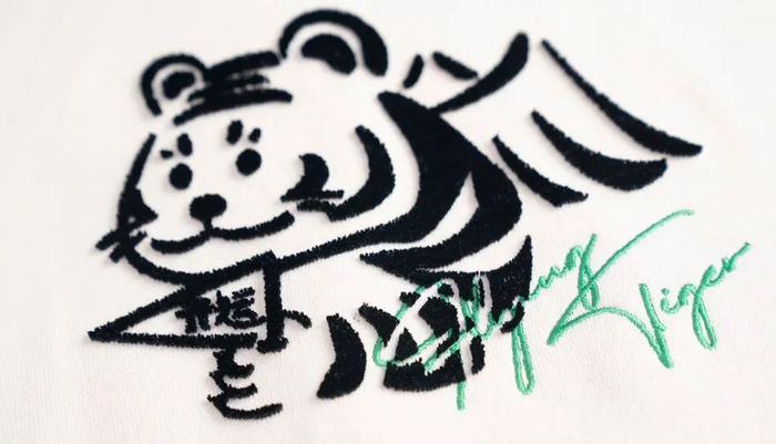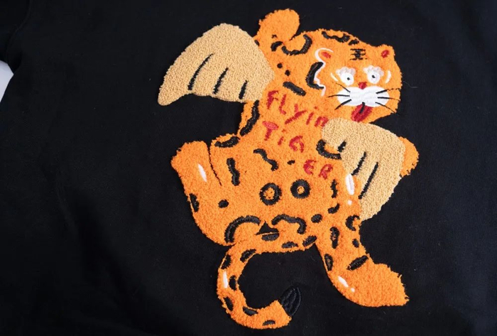 毛圈刺绣与立体刺绣的结合,配以“flying tiger”的英文字母,用荧光线挑亮,更符合当下国潮流行审美,简约又不失大气。
