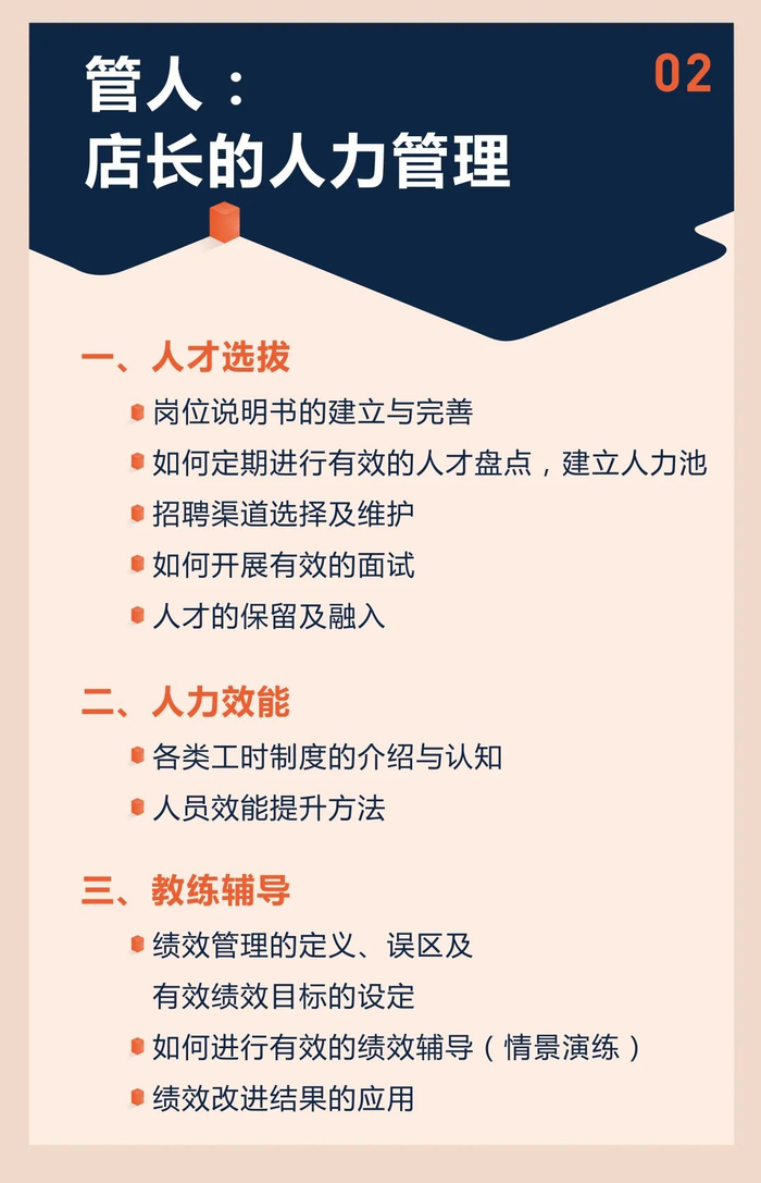 这堂课程,将帮助店长明确店内分工,完成自己身份转变,提高团队协作效率,从而维持门店的有序运营。