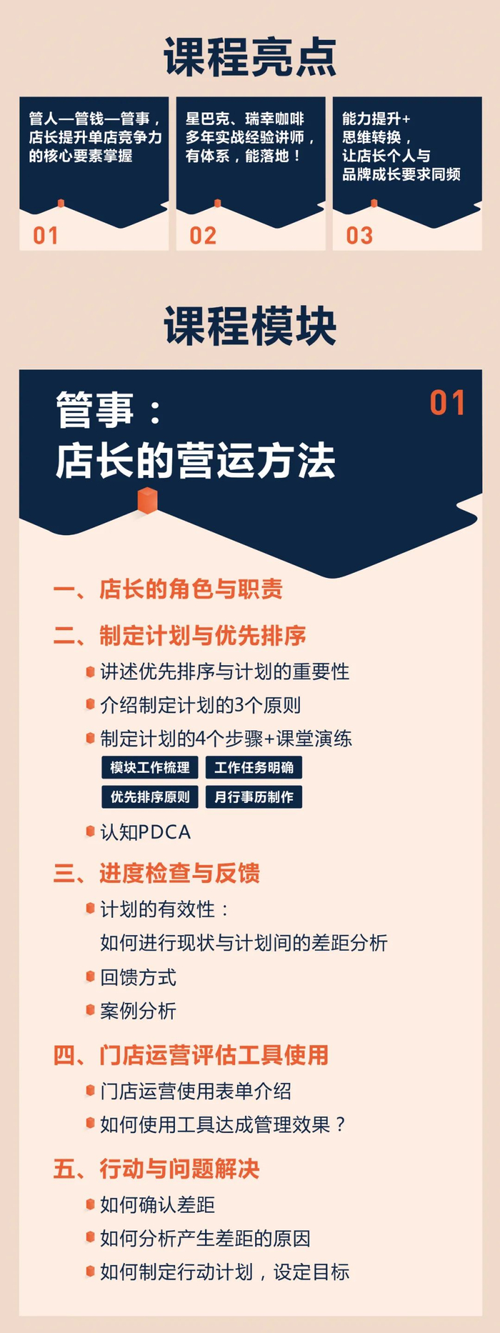3天的时间里,课程将聚焦店长管理门店的三大模块:人、钱、事。