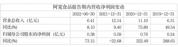 可惜在2021年,上升趋势似乎正被打破。较2019年、2020年超50%的增长率,阿宽食品2021的营收增速已大幅放缓至9.40%。