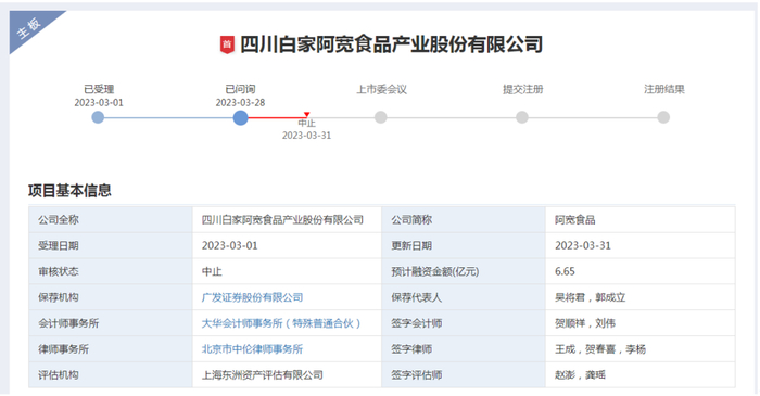可惜没几天,就被摁下了暂停键。据深交所官网信息显示,冲刺深交所主板的四川白家阿宽食品产业股份有限公司(以下简称“阿宽食品”),其上市审核已在3月31日中止。