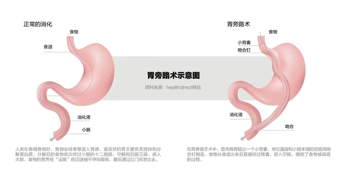 胃旁路手术改变了消化道结构,主要从“减少摄入、减少吸收”两方面,帮助患者减重或治疗肥胖的相关代谢疾病。医生会将患者的胃分离成上下两部分,形成近端的胃小囊和远端的胃大囊,同时将小肠切分,把下端小肠的接口与胃小囊缝合,上端小肠的接口与下端肠缝合。术后,患者吞咽的食物会先进入胃小囊,绕开大部分胃和一部分小肠,直接进入空肠,食物被吸收的过程因此缩短。