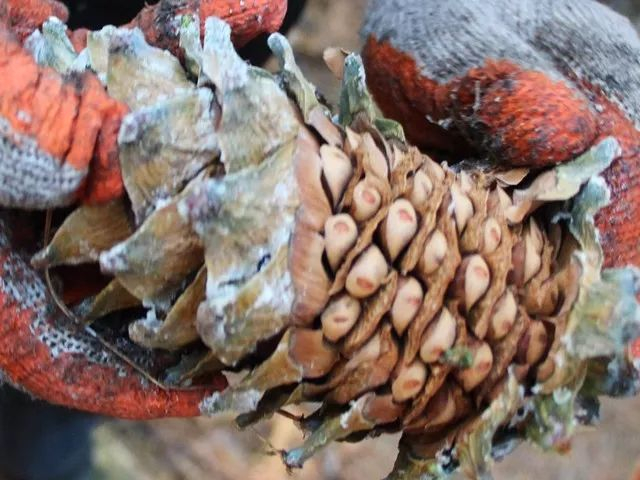 注:野生红松,主要分布在东北的长白山山脉、小兴安岭地区。属于国家一级濒危物种,不允许人工种植、砍伐,可以采摘松塔,但需注意不能破坏树木。