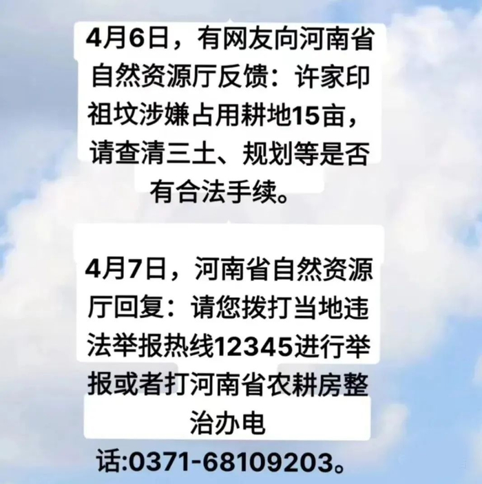 今年4月6日,有网友向河南省自然资源厅反馈:许家印(位于河南周口老家的)祖坟涉嫌占用耕地15亩,请查清三土、规划等是否有合法手续。4月7日,河南省自然资源厅回复:请您拨打当地违法举报热线12345进行举报或者打河南省农耕房整治办电话。如今许家印被抓了,许家陵园恐怕很难再保全。