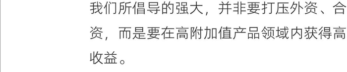而我们所倡导的强大,并非要打压外资、合资,而是在高附加值产品领域内获得高收益。我们不寻求一家独大,打压对手,只是希望中国企业能够享受高附加值产品带来的收益。高收益意味着我们的企业能够轻松赚钱。一个进口轴承的利润相当于出口几十件甚至上百件低附加值产品的利润总和。