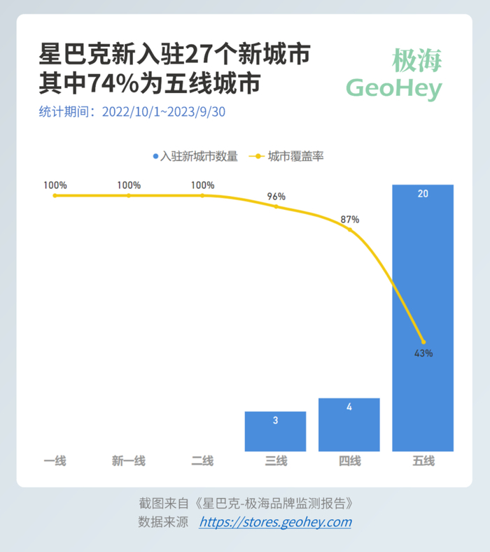最容易想到的方法莫过于开辟新的城市。没错,星巴克在过去的12个月中新入驻城市达到27个,覆盖了全国71%的地级市。